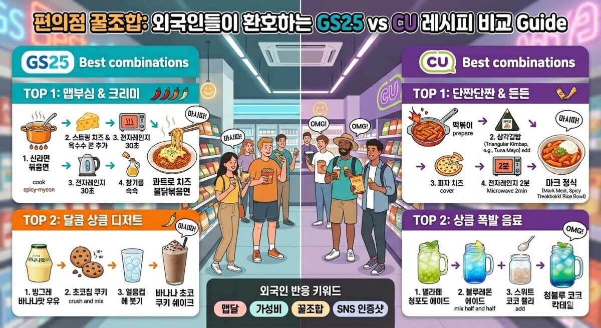외국인 관광객들 사이에서 ‘K-편의점’은 필수 여행 코스로 자리 잡았습니다. 특히 GS25와 CU는 각기 다른 시그니처 아이템을 활용한 ‘꿀조합’으로 유명한데요, 두 편의점의 대표 레시피를 인포그래픽 스타일로 비교해 드립니다. 🏪 K-Convenience Store Food Battle: GS25 vs CU 구분 GS25 (The Classic & Savory) CU (The Trendy & Sweet) 대표 메뉴 마크정식 (Mark Meal) 연세우유 푸딩 파르페 난이도 … 더 읽기